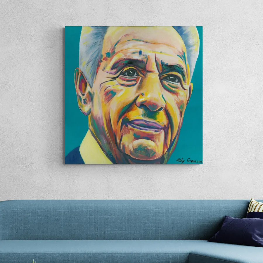 פרס, זוכה פרס נובל לשלום, היה ממובילי תעשיית הביטחון בישראל ופעל כל חייו לקידום שלום וביטחון. הציור מצויר בסגנון ריאליסטי וממחיש את דמותו בחום ובעומק, עם מבט חכם ומלא חמלה שמזמין התבוננות והשראה.