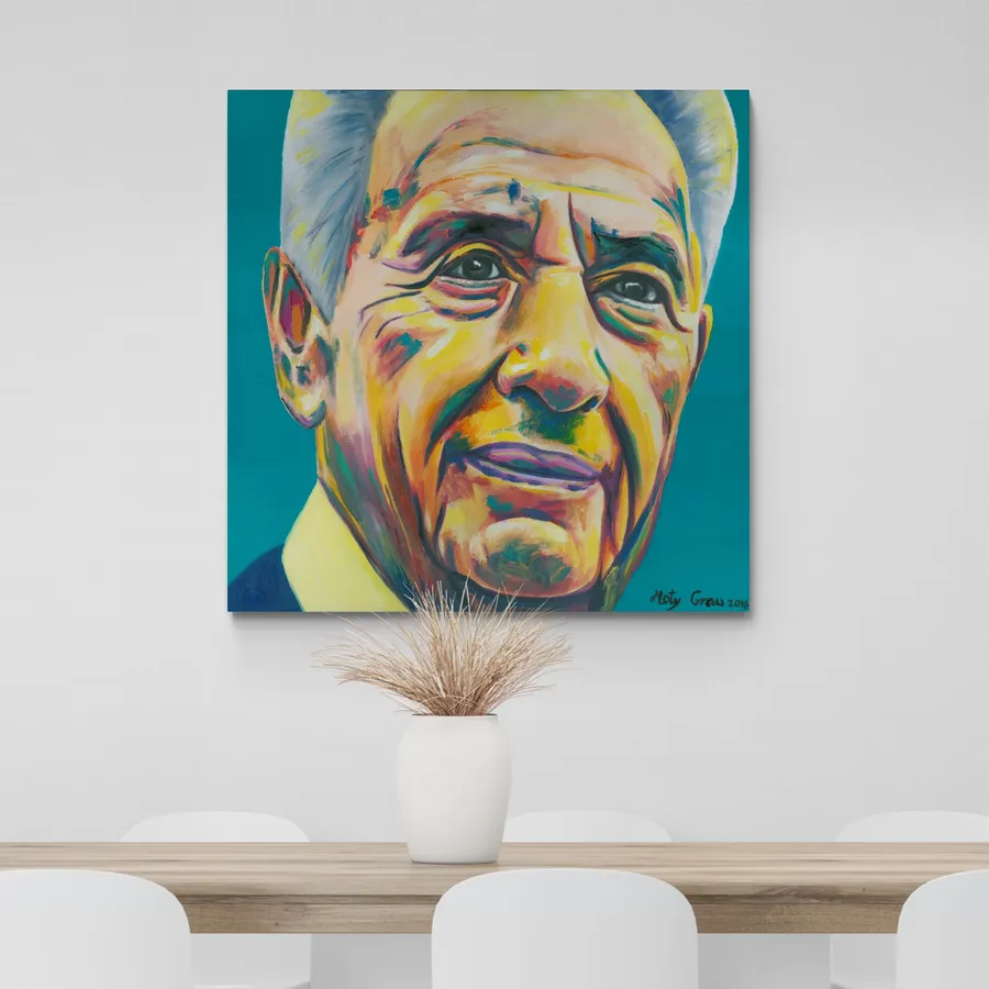 הפורטרט המיוחד הזה של שמעון פרס. הציור הזה, שנעשה זמן קצר לאחר פטירתו ב-2016, הוא מחווה למורשתו ולהשפעתו העצומה.