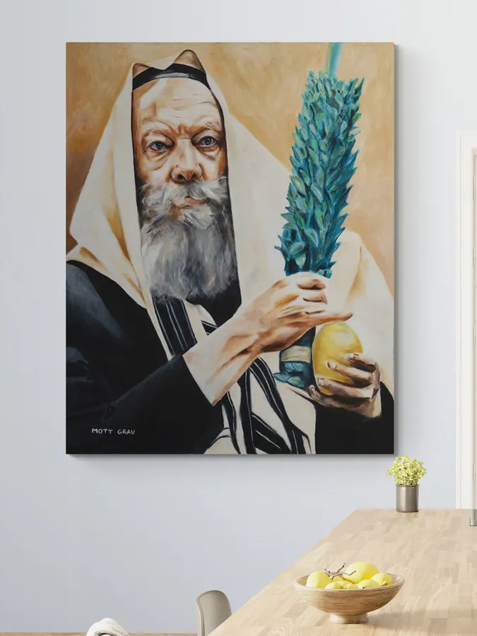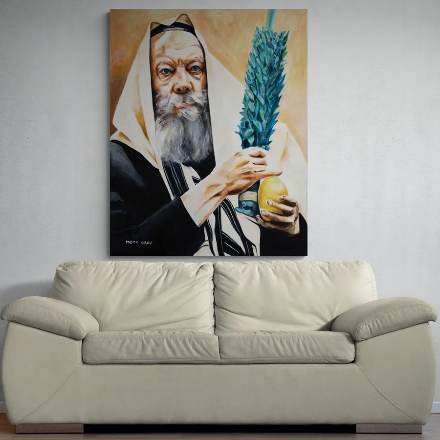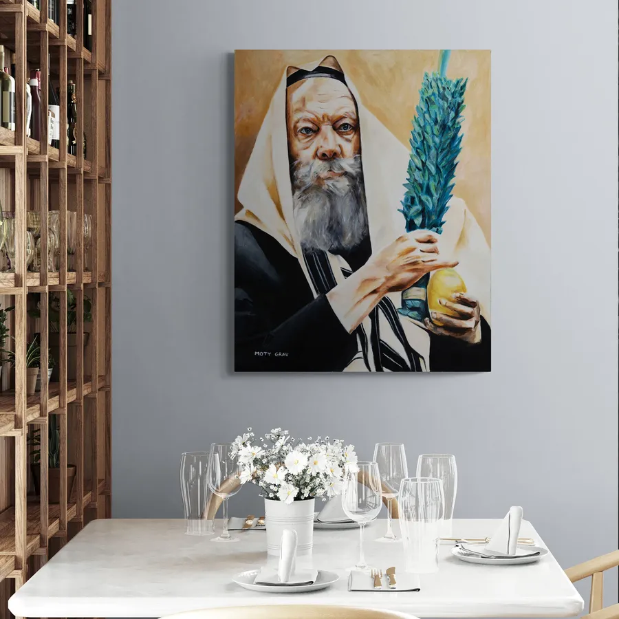 הרבי עטוף בטלית, מברך על ארבעת המינים בחג הסוכות, ומקרין שלווה, אמונה ועוצמה פנימית. כשאתם מתבוננים בציור, תרגישו את החיבור הרוחני שהוא משרה – תחושה של הדרכה, השראה וברכה לביתכם.